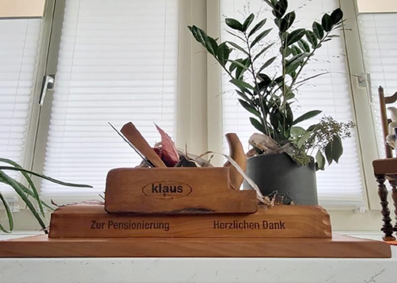 Wir wünschen Christoph alles Gute in seiner Pension. Als Zeichen unserer Wertschätzung haben wir ihm einen gleichaltrigen Handhobel mit einer persönlichen Widmung sowie Blumen als Dekoration überreicht.