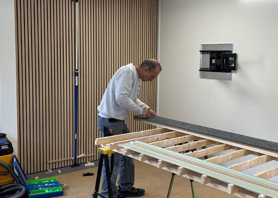 Die Realisierung des Projekts wurde durch die enge Zusammenarbeit mit regionalen Partnern sichergestellt. Leo Klaus unterstützte bei der Holzauswahl und entwarf den Tisch. Nach der Entscheidung für Entwurfsskizzen übernahm Schreinerei Klaus die detaillierte CAD-Planung sowie die präzise Fertigung und Montage aller Holzelemente und des Metalleinbaus. So entstand aus einer Notlösung ein hochwertiger, maßgeschneiderter Arbeitsplatz, der Funktionalität und exklusives Design vereint.