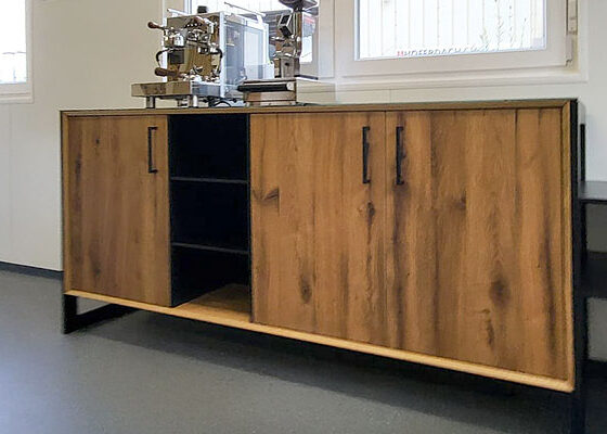 - Metall-Design: Das Gestell des Tisches sowie ein Sideboard für die Kaffeemaschine wurden passend zur Hofer Dach AG aus Metall gefertigt.