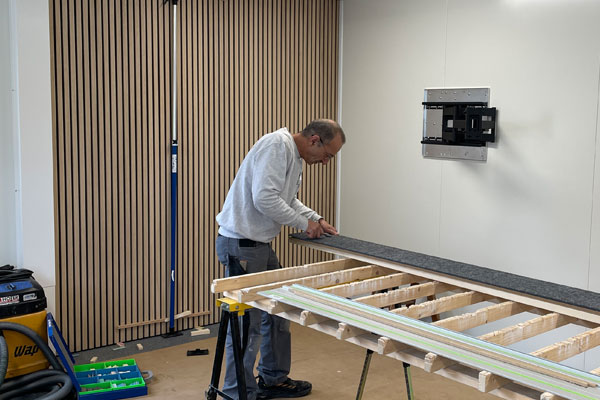 Die Realisierung des Projekts wurde durch die enge Zusammenarbeit mit regionalen Partnern sichergestellt. Leo Klaus unterstützte bei der Holzauswahl und entwarf den Tisch. Nach der Entscheidung für Entwurfsskizzen übernahm Schreinerei Klaus die detaillierte CAD-Planung sowie die präzise Fertigung und Montage aller Holzelemente und des Metalleinbaus. So entstand aus einer Notlösung ein hochwertiger, maßgeschneiderter Arbeitsplatz, der Funktionalität und exklusives Design vereint.