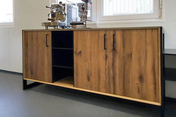 - Metall-Design: Das Gestell des Tisches sowie ein Sideboard für die Kaffeemaschine wurden passend zur Hofer Dach AG aus Metall gefertigt.